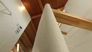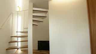 玄関を入ると目に飛び込んで来るのが螺旋階段。奥に行くに従って広がる階段室が広がりを感じさせます。2階までの縦スリット窓から採光します。 |
