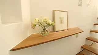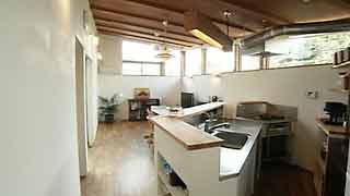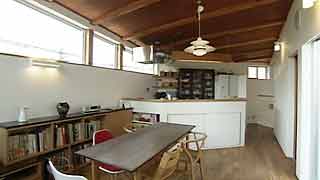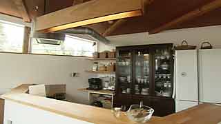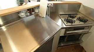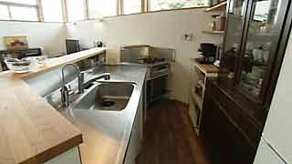 建物の変形に合わせ「平行四辺形」になった台所。対面式のカウンターも「く」の字形になっています。照明と換気扇フードは、もちろん特注品。 |