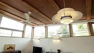 2階に上がると18畳大のLDK。連続する高窓は採光はもちろん、向いの緑地を借景します。白い壁は、調湿性の高い漆喰塗り。 |