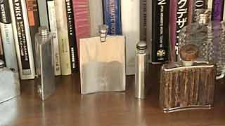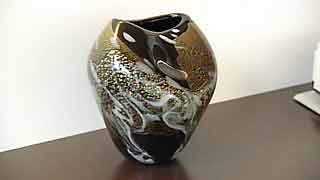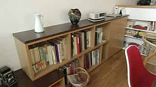 濃い茶色の収納は、奥さんがデザインしたもの。飾られているのは、お父さんの形見の品々や吹きガラス職人である弟さんの作品たちです。 |