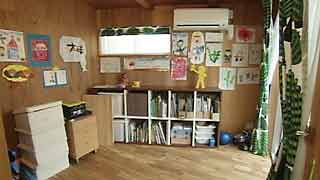 LDKに隣接する5角形の子供室。LDKと子供室に「L」字形に囲まれるようにテラスを設置。下階の採光を確保するため、テラスの床はグレーチングです。 |