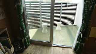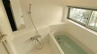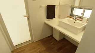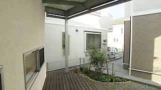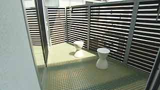 1階の浴室も台形。「L」字形に囲まれた中庭に面しています。こちらにテラスを設置。こちらは木製です。 |