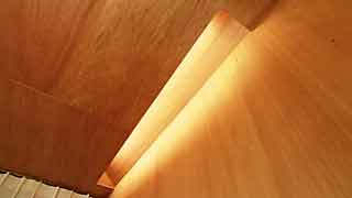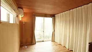 寝室の床は杉、天井・壁はラワン合板張り。仕上げにメリハリを付けて初期コストを抑えました。光源の見えない凝った間接照明にこだわりが感じられます。 |