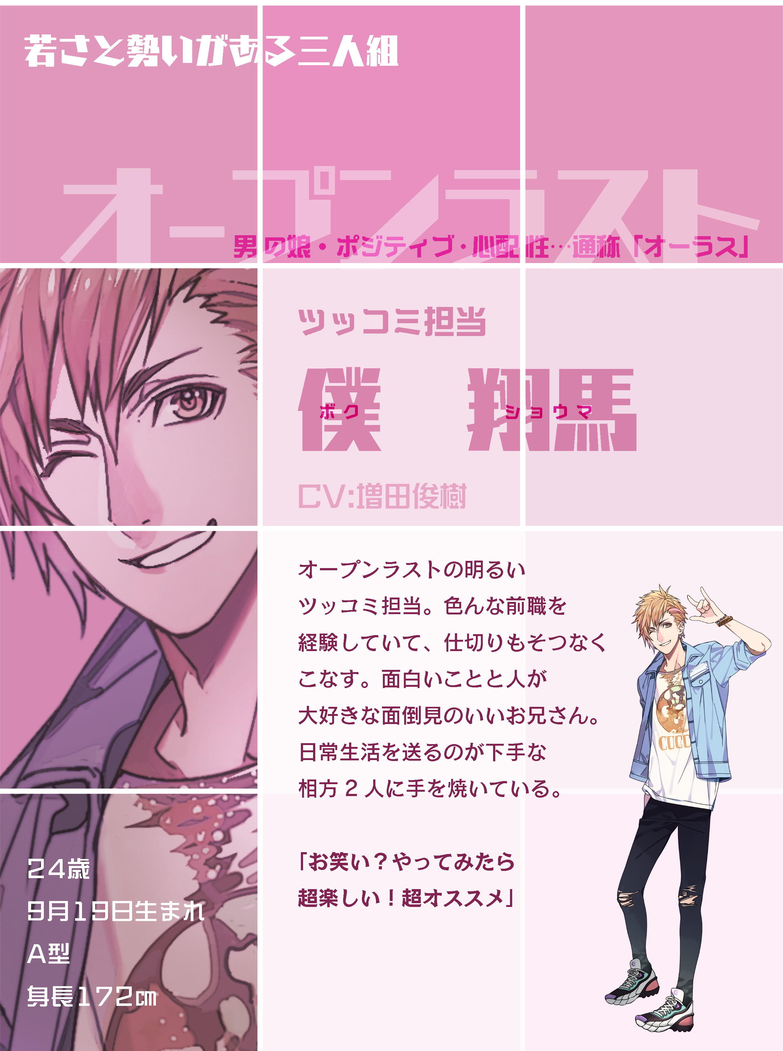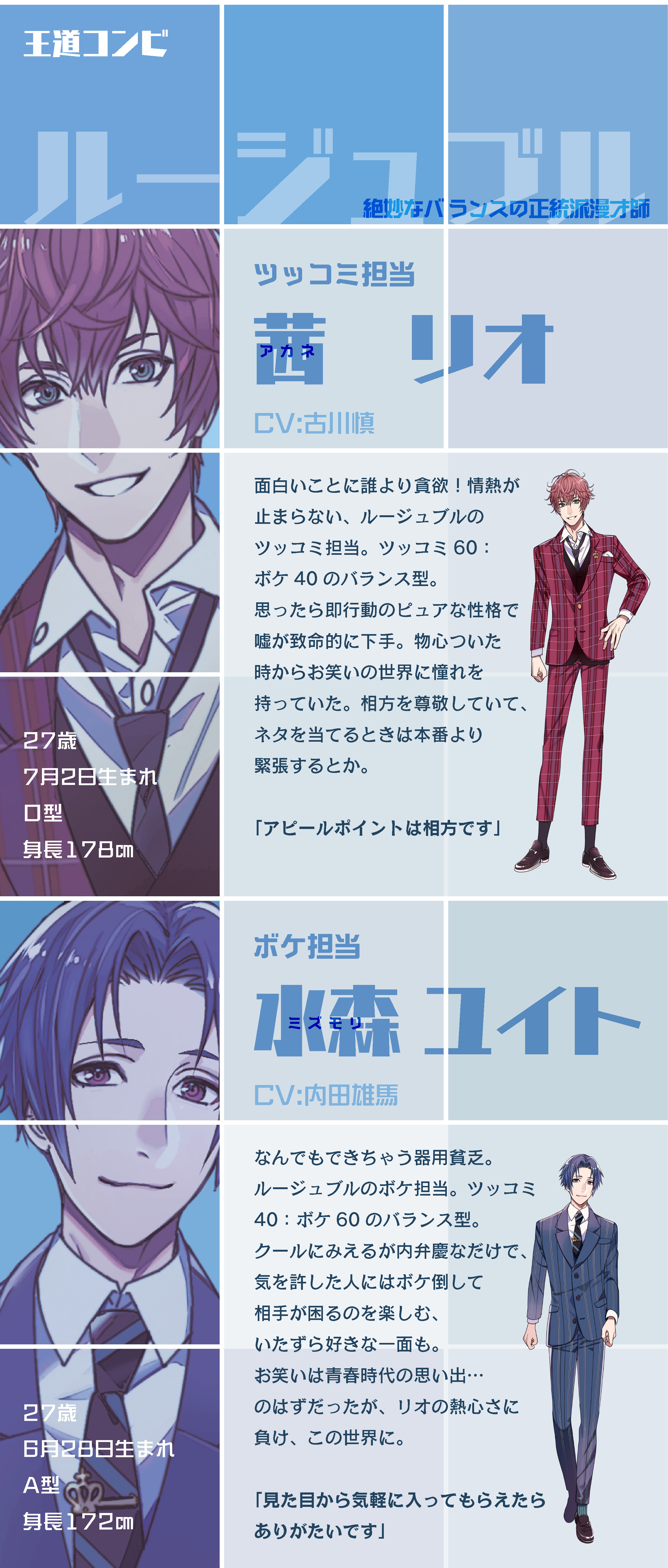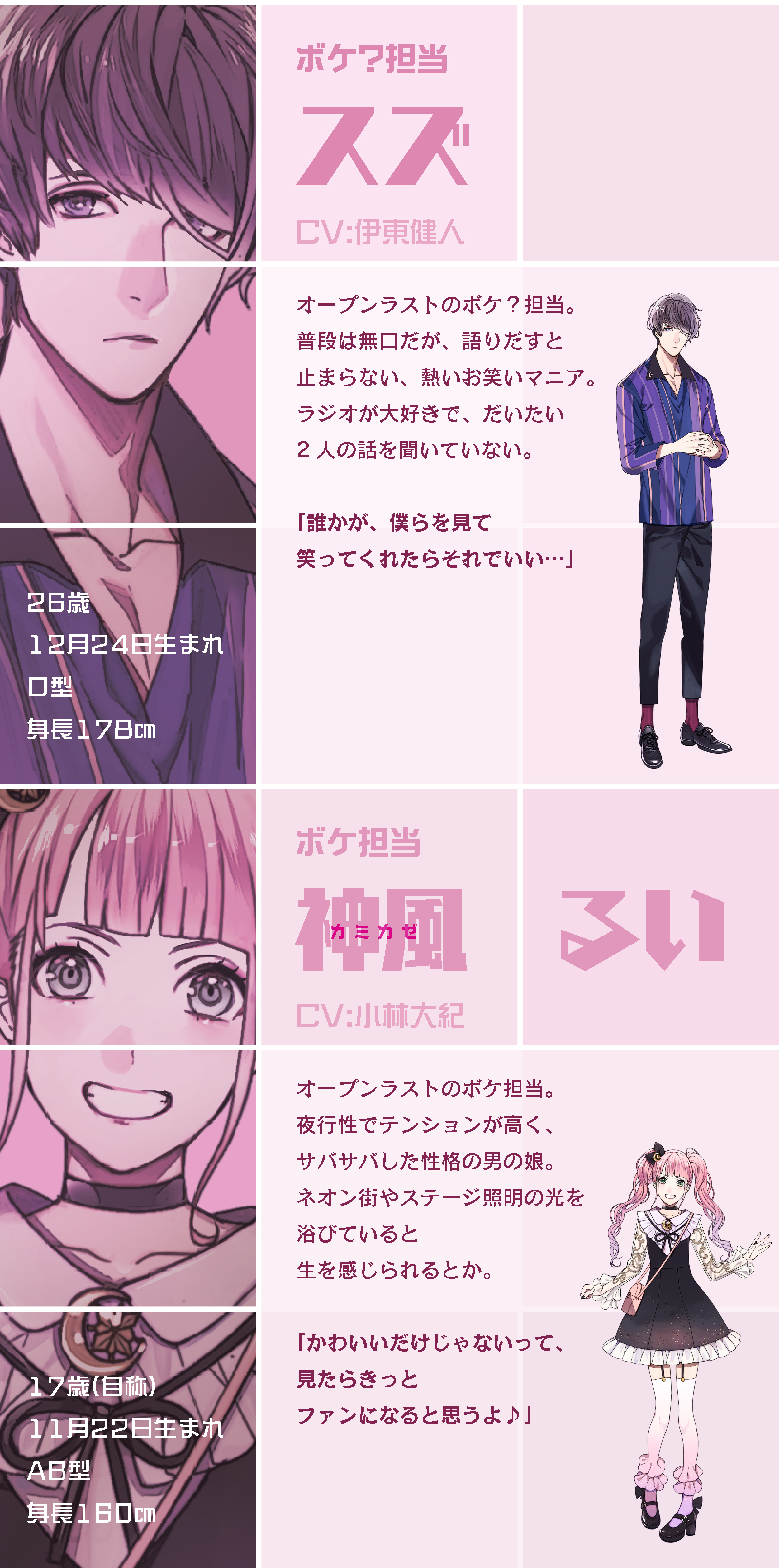 ■出演:霜降り明星 / 宮田俊哉(Kis-My-Ft2) 【ネタ作成】霜降り明星 / ジャルジャル / 板倉俊之(インパルス) 【声の出演】 茜リオ:古川慎 水森ユイト:内田雄馬 澗・京:杉田智和 繊細とい:斉藤壮馬 僕翔馬:増田俊樹 スズ:伊東健人 神風るい:小林大紀 墨乃白紙:森久保祥太郎 (※順不同)