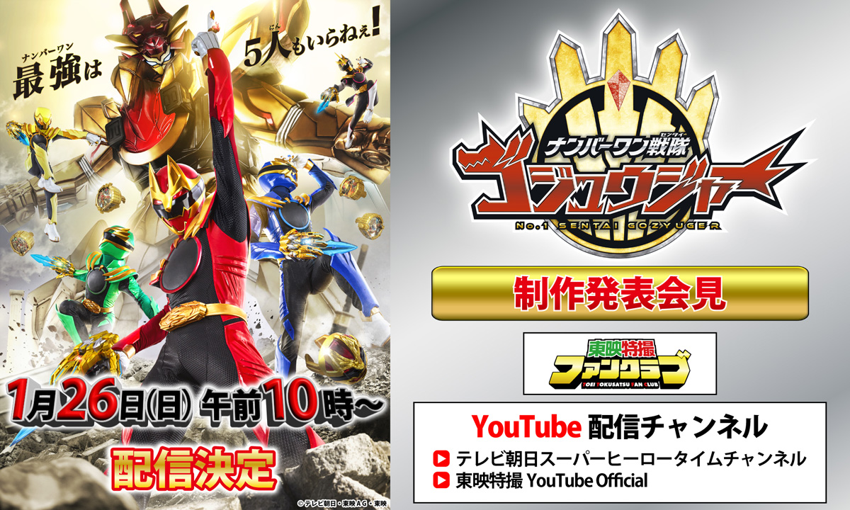 2025年2月16日(日)にスタートするスーパー戦隊シリーズ最新作『ナンバーワン戦隊ゴジュウジャー』。本作は、その名のとおり、これまでのスーパー戦隊の中でも、最高最強の《ナンバーワン》を目指し、子どもたちに圧倒的な人気を誇る動物や恐竜=《獣(けもの・ジュウ)》をモチーフにしたヒーローが活躍する物語です。最新作の詳細に期待が高まる中、ついに、皆さんお待ちかねの制作発表会見の開催が決定! 1月26日(日)午前10時から、《東映特撮YouTube Official》 《TTFC(東映特撮ファンクラブ)》 《テレビ朝日スーパーヒーロータイムYouTubeチャンネル》で、その模様を配信することになりました。“2月の放送スタートまで待ちきれない”という皆さん、『ナンバーワン戦隊ゴジュウジャー』の全ぼうが明かされる制作発表会見を、どうぞお見逃しなく!