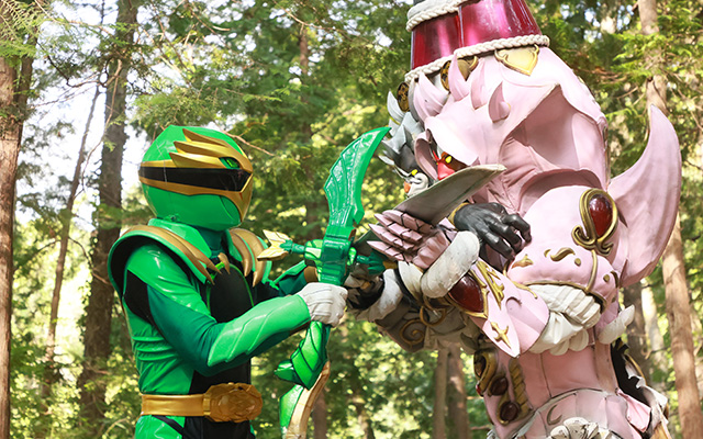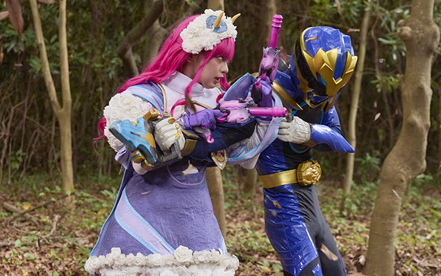 覚醒したテガジューン(声:ゆかな)に連れ去られたグーデバーン(声:KENN)は、“破滅の王子テガナグール”として再教育を受けることに…。そんなグーデバーンを救うため、ゴジュウジャーたちもノーワンワールドへ! それぞれがブライダンと戦うなかで陸王(鈴木秀脩)は、憎しみにとらわれたブーケ(まるぴ)と再び向かい合う。アイドルとファンでありながら敵同士な2人は、戦わなければいけない哀しい運命…。それでも陸王はブーケに、「君に幸せでいてほしい」と語りかける。