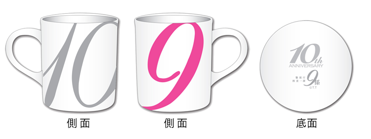 第1弾は、9係の「9」と10周年の「10」をデザインした、シックでカッコいいマグカップです。大人の手で持ちやすいサイズで、底面にロゴがあしらわれています。