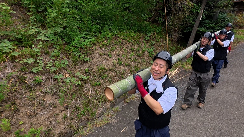 とても背の高い竹なので、みんなで協力して竹を切り、運びます!