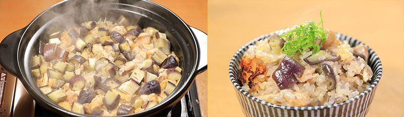 鶏もも肉、油揚げ、ナス、ごま油を入れ火にかける。 - 沸騰したら弱火にして約12分炊き、火を止めて10分蒸らす。