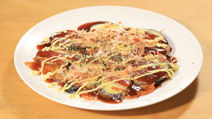 チーズが溶けてきたらひっくり返し、蓋をして3分蒸し焼きにする。 - 皿にうつし、ソース、マヨネーズ、かつお節、青のりをかける。