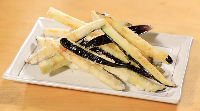 密閉袋にナスと片栗粉を入れ、全体にまぶす。 - 170℃に熱した油で2分揚げ、お好みで塩をかける。