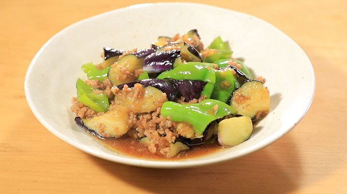 水分が飛んだら、水溶き片栗粉を入れてとろみをつけ、ボウルに移す。 - 170℃の油で乱切りにしたナスとピーマンを揚げる。