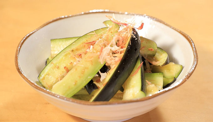 - ナスは、ヘタを取り、縦半分に切り、皮に格子状の切り込みを入れる。