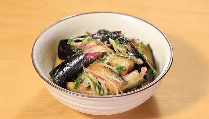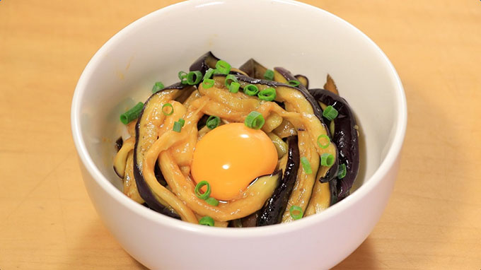 コチュジャンを入れ混ぜ合わせ、ナスと和える。 - 器に盛って卵黄をのせ、青ネギをちらす。