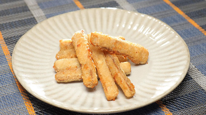 - 片栗粉をつけて、170℃の油で約3分揚げる。