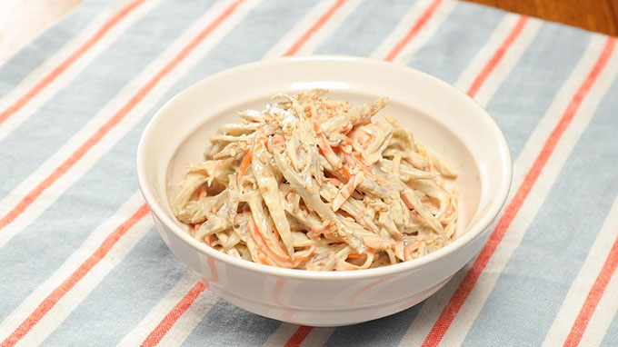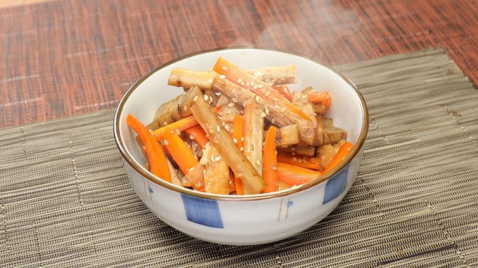 - ごぼう、ニンジンを加え混ぜ合わせ、白ごまをかける。
