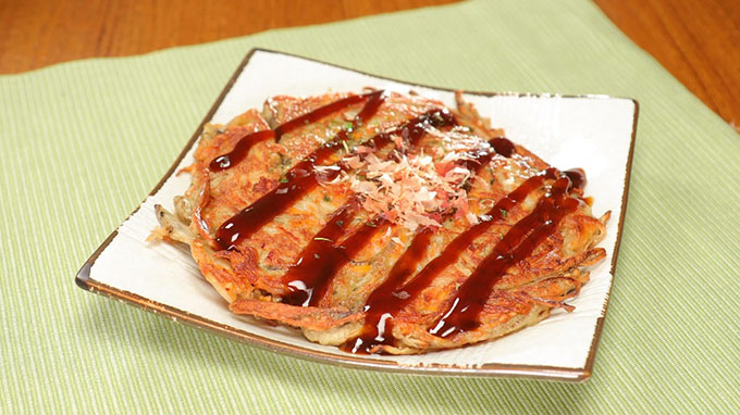 - フライパンにサラダ油をひき、丸形に生地をひろげ、生地の上に豚バラ肉をのせて蓋をし、 中火で2分、ひっくり返して3分焼く。