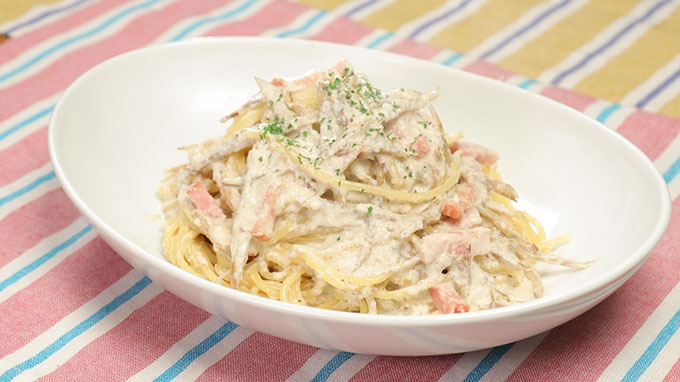 - 沸騰した湯に塩(分量外)を入れ、スパゲッティを表示時間通り茹でる。