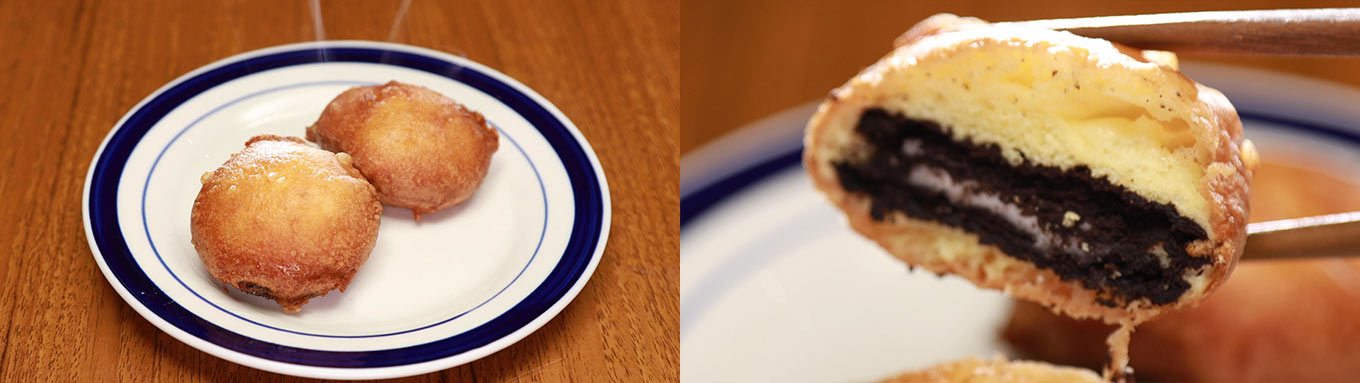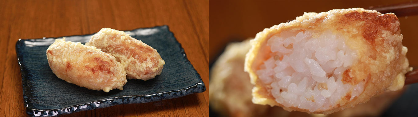 - 稲荷寿司に天ぷら衣をつけ、180℃の油で約1分揚げる。