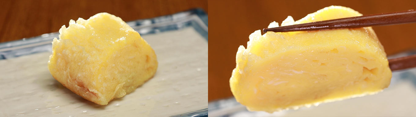 - だし巻き玉子に天ぷら衣をつけ、150℃の油で約1分揚げる。