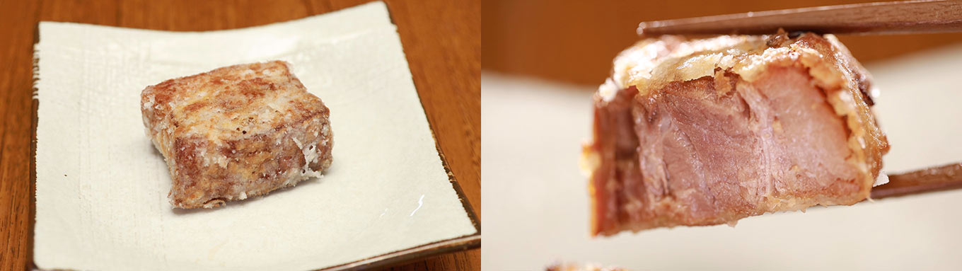 - 豚の角煮に片栗粉をまぶし、余分な粉をはたく。