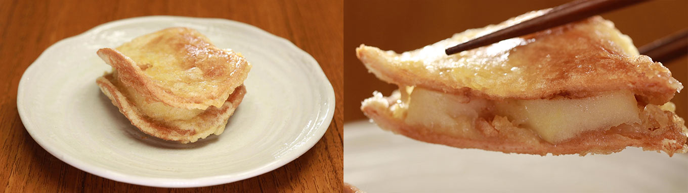 - 生姜せんべいでりんご、シナモンパウダーを挟み、形が崩れないように天ぷら衣にくぐらせる。