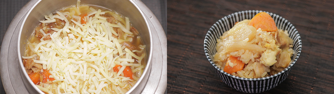 - 肉じゃがを入れて溶き卵を回しかけ、チーズをのせ氷を入れて炊く。