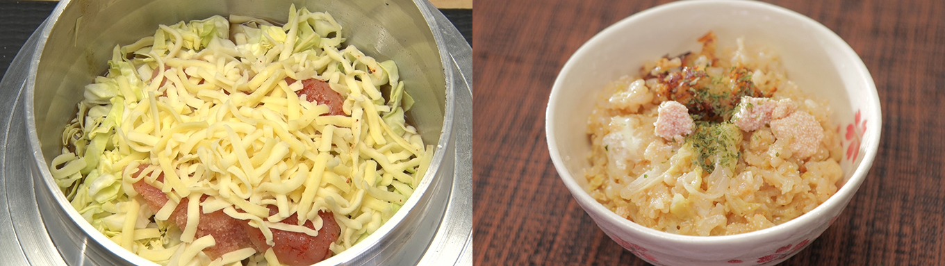 - 太めの千切りにしたキャベツ、明太子、バター、チーズ、氷を入れて炊く。