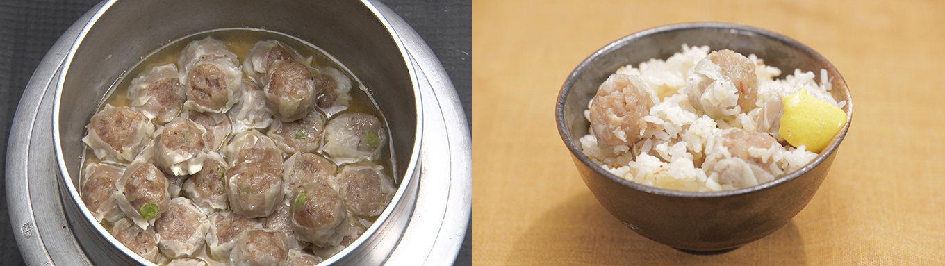 - みじん切りにしたしょうがを入れ、シウマイを並べ氷を入れて炊く。