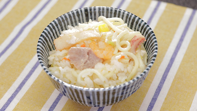 - 炊飯器の釜に浸水して水気を切った米と水、塩、コショウ、冷凍食品のちゃんぽんの中身すべてと牛乳を入れ、炊く。
