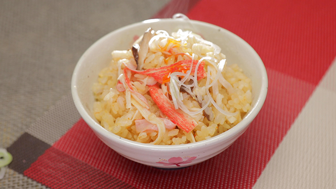 - たけのこ、しいたけ、カニカマボコをのせ、溶き卵、氷を入れて炊く。