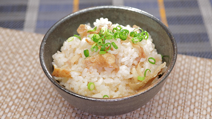 - 炊飯器の釜に浸水して水気を切った米、かつお昆布ダシ、あぶらかす、しょう油、塩、氷を入れて炊く。