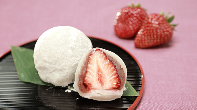 - イチゴの先端をあんにのせ、逆さまにして重力を使いながら包み、生地を閉じる。