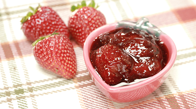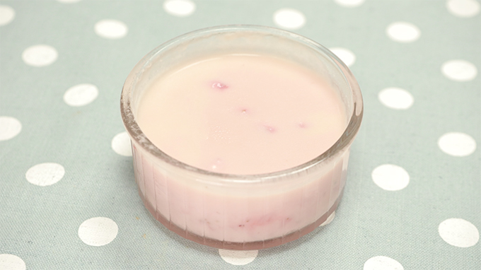 - イチゴジャム、レモン汁を加えてよく混ぜ、ラップをして500Wの電子レンジでさらに10秒加熱し、しっかり混ぜ合わせる。