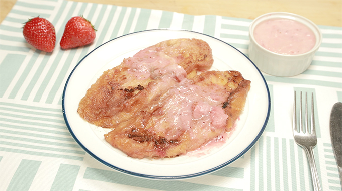 - フライパンにイチゴバターを溶かし、浸したフランスパンを弱火で片面3分焼き、返して2分焼く。