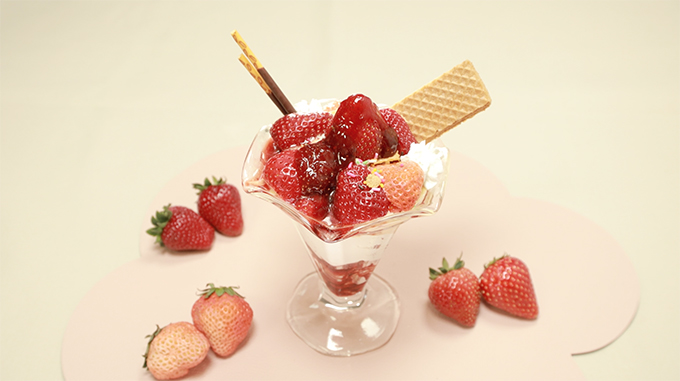 - イチゴジャム、スポンジケーキ、コーンフレーク、アイス、イチゴ、ウエハースなどを用意する。