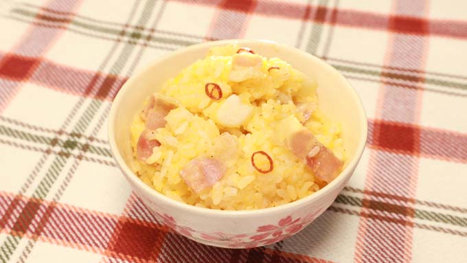 - 炊飯器の釜に浸水して水気を切った米、水、にんにく、鷹の爪、昆布茶、ベーコン、オリーブオイル、合わせたクリーム、氷を入れて炊く。