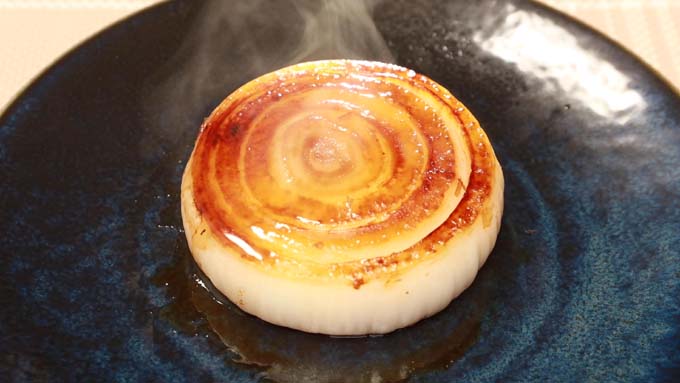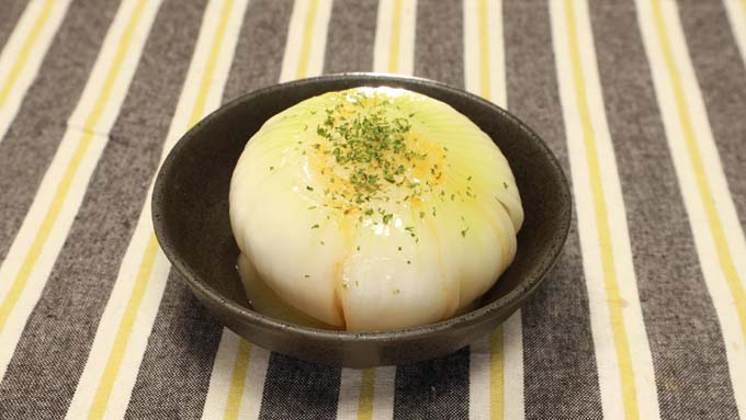 - 新玉ねぎをボウルに入れ、600W の電子レンジで3分半加熱する。