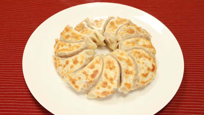 - フライパンにごま油をひき、餃子を並べ、水を加えフタをして中火で約2分半蒸し焼きにする。
