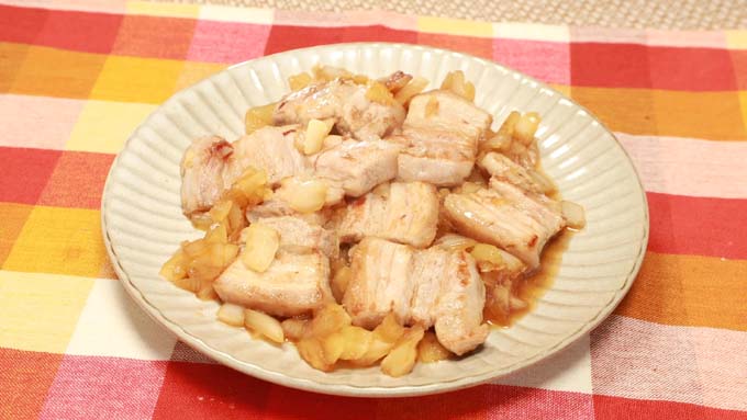 - 新玉ねぎの丸ごと漬けを加え、豚肉と馴染むように炒める。