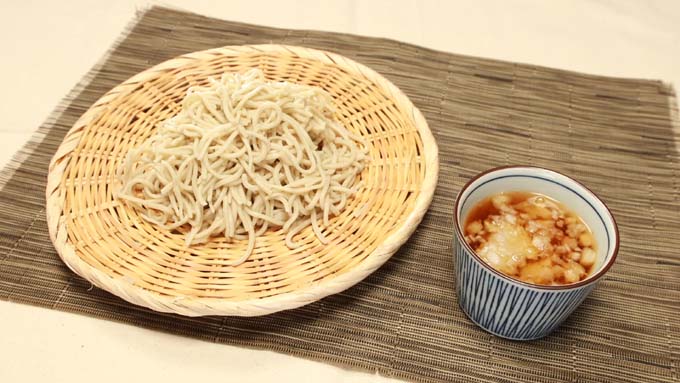 - そばちょこに、粗みじん切りにした新玉ねぎの丸ごと漬け、漬け汁を入れ、同量の水で割る。