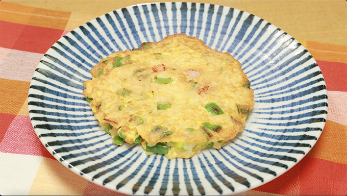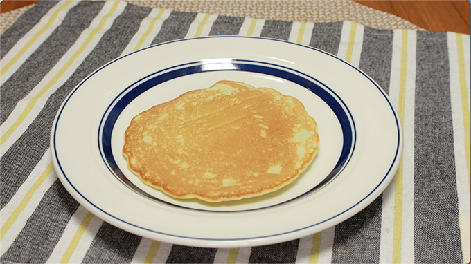- フライパンにサラダ油をひき、お玉一杯分の生地を流し入れ、弱火で3分焼き、生地がフツフツとしてきたら裏返して2分焼く。