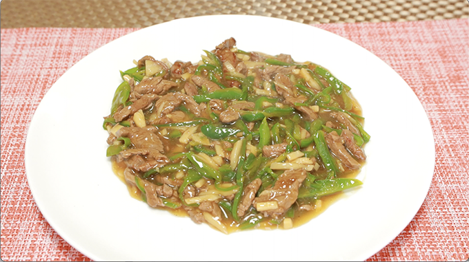 - 中華鍋にごま油を熱し、牛肉を色が変わるまで中火で炒め、たけのこ、ピーマンを加えてしんなりするまで火を通す。