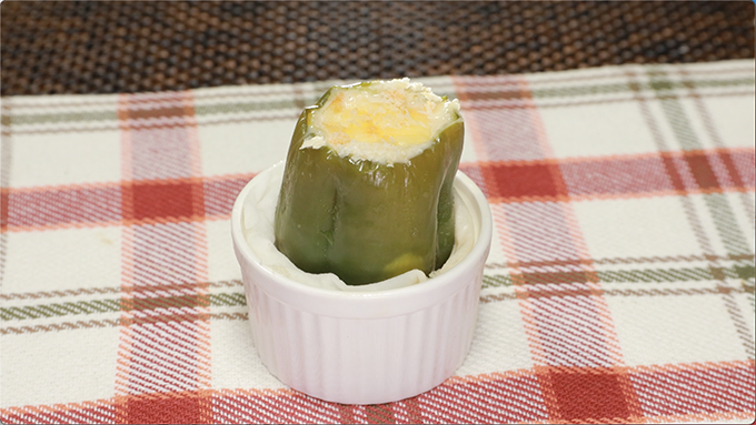 - ピーマンにマッシュルーム、ハム、ホワイトソースを入れ、ピザ用チーズ、パン粉をのせる。