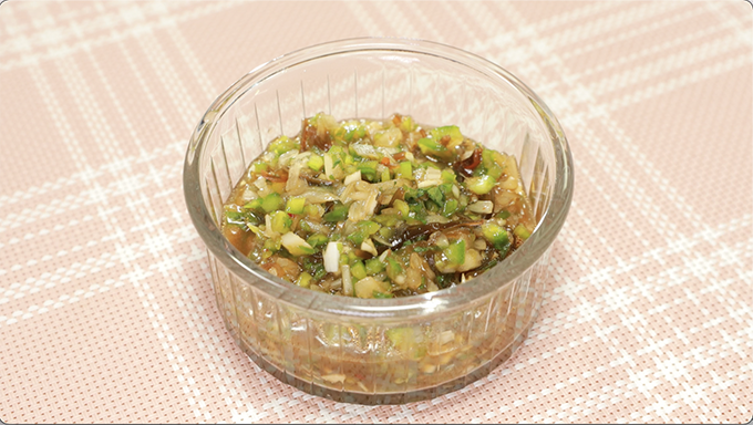 - ピーマン、玉ねぎ、大葉、しょうが、にんにくをみじん切りにし、塩昆布と合わせる。