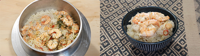 - 炊飯器の釜に浸水して水気を切った米、エビ、しょうが、ナンプラー、付属の乾燥具材、水に溶かしたトムヤムクンペースト、ライムを搾り、氷を入れて炊く。