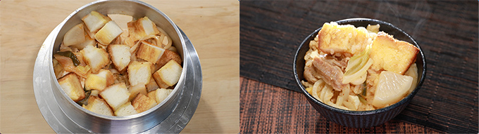 - 炊飯器の釜に浸水して水気を切った米、キムチ鍋を汁ごと、フレンチトースト、氷を入れて炊く。