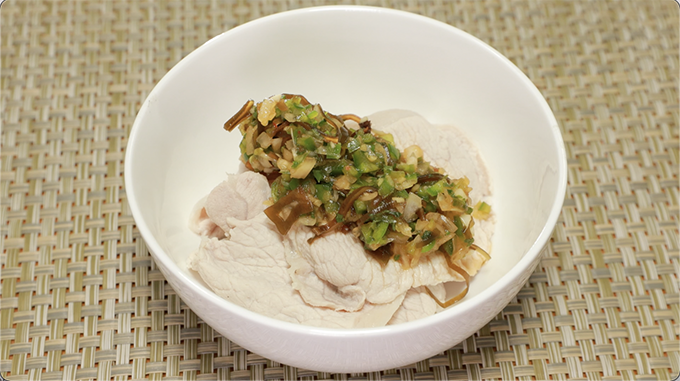 - 水に塩を入れて沸かし、酒を加えて豚肉を茹で、水気を切る。