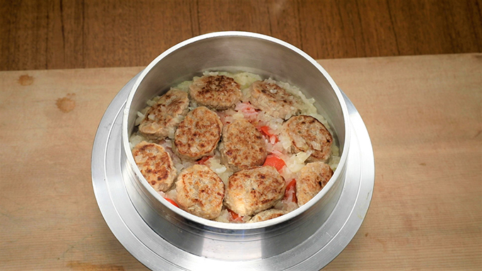 - 先に、じゃがいもを加え、その上に浸水し水気を切った米、コンソメスープ、グレービーソース風調味ダレ、チーズを入れて炊く。