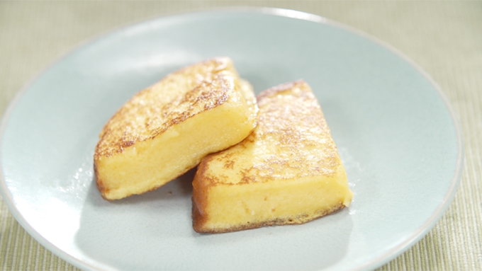 - フライパンにバターを入れて溶かし、カステラを入れ、弱火で両面焼き色がつくまで焼く。